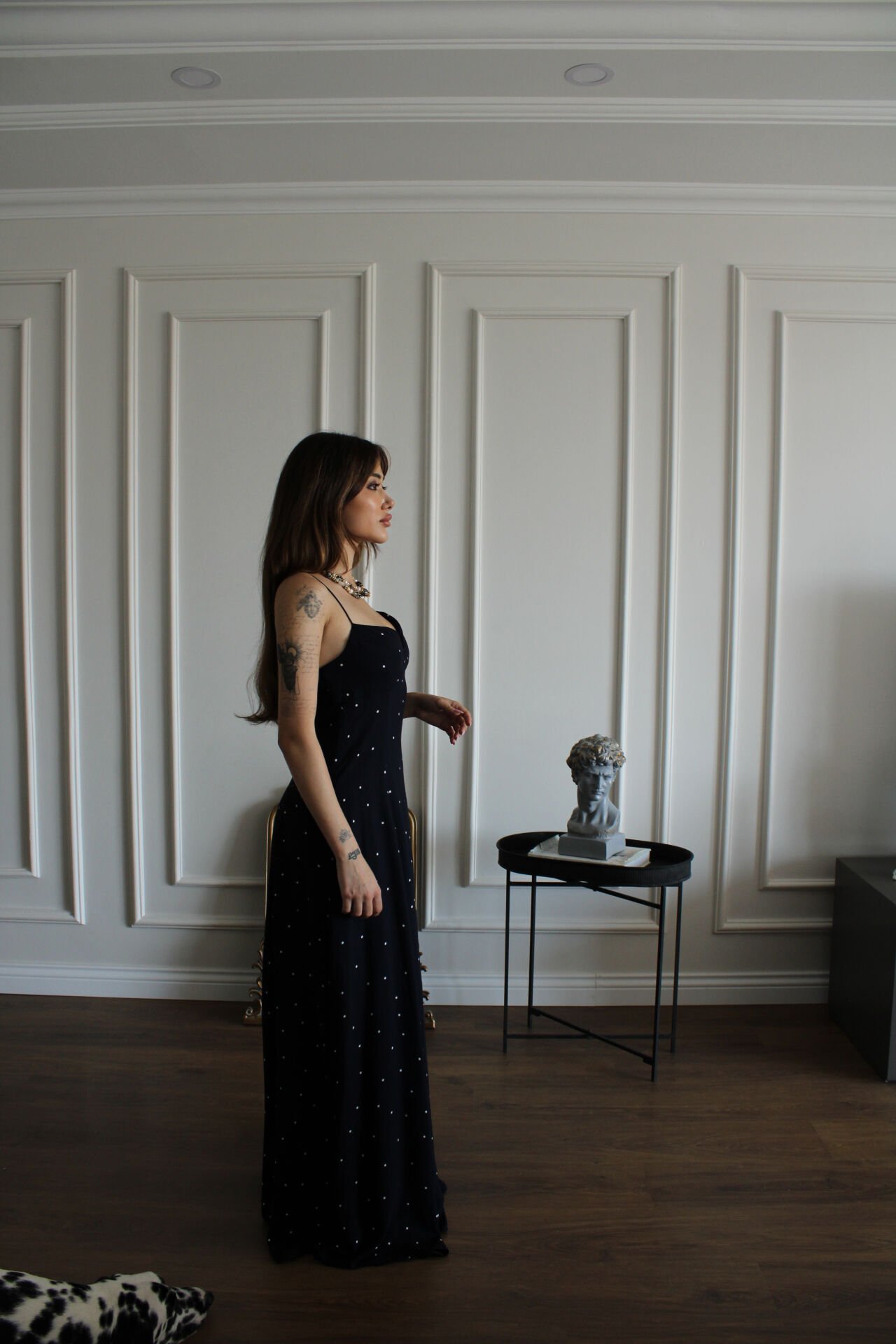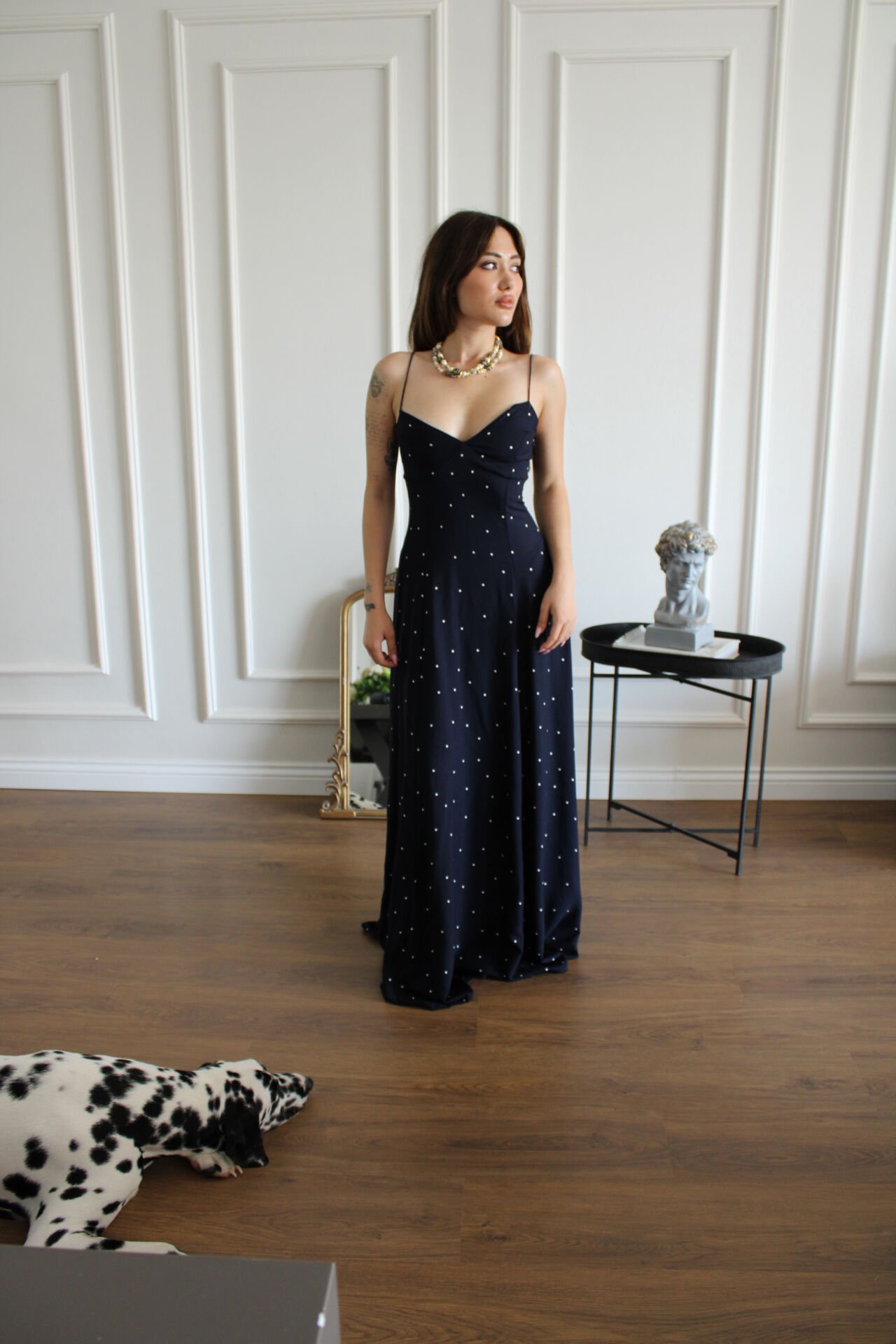 Askılı Lacivert Puantiyeli Maxi Boy Elbise