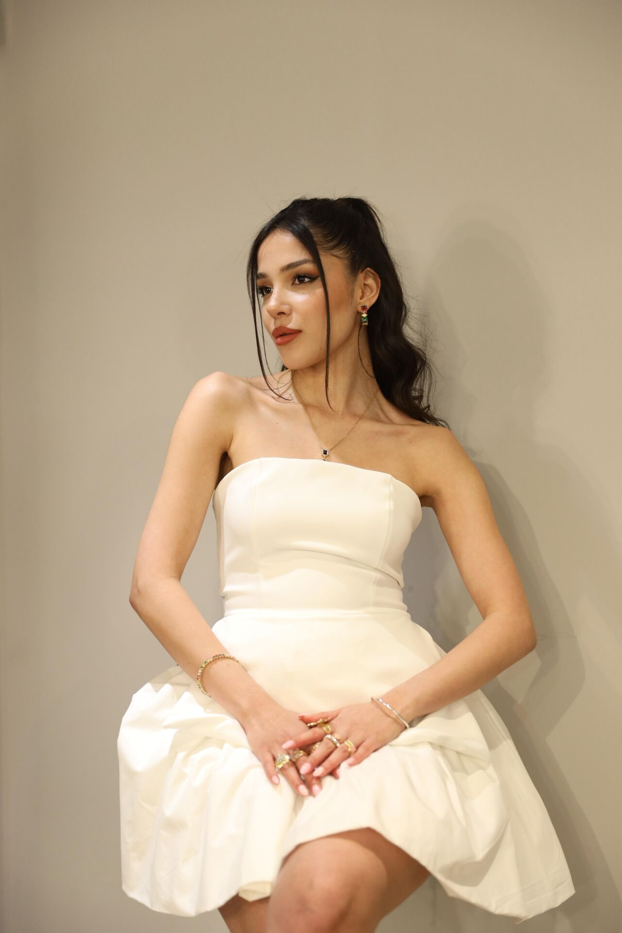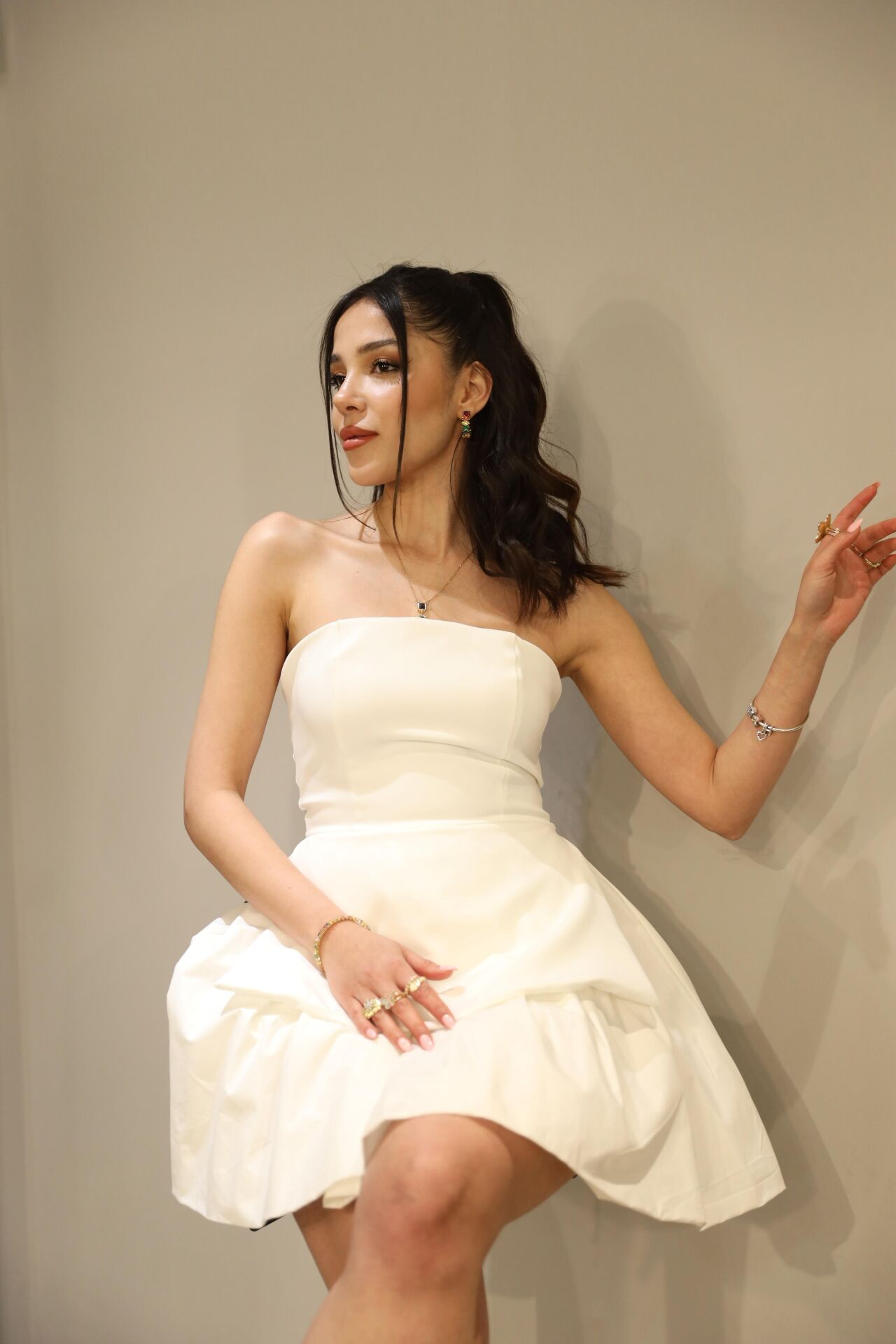 Straplez, yırtmaç detaylı, arkası gizli fermuar kapamalı, içi astarlı, balon etekli elbise. Normal kalıp.