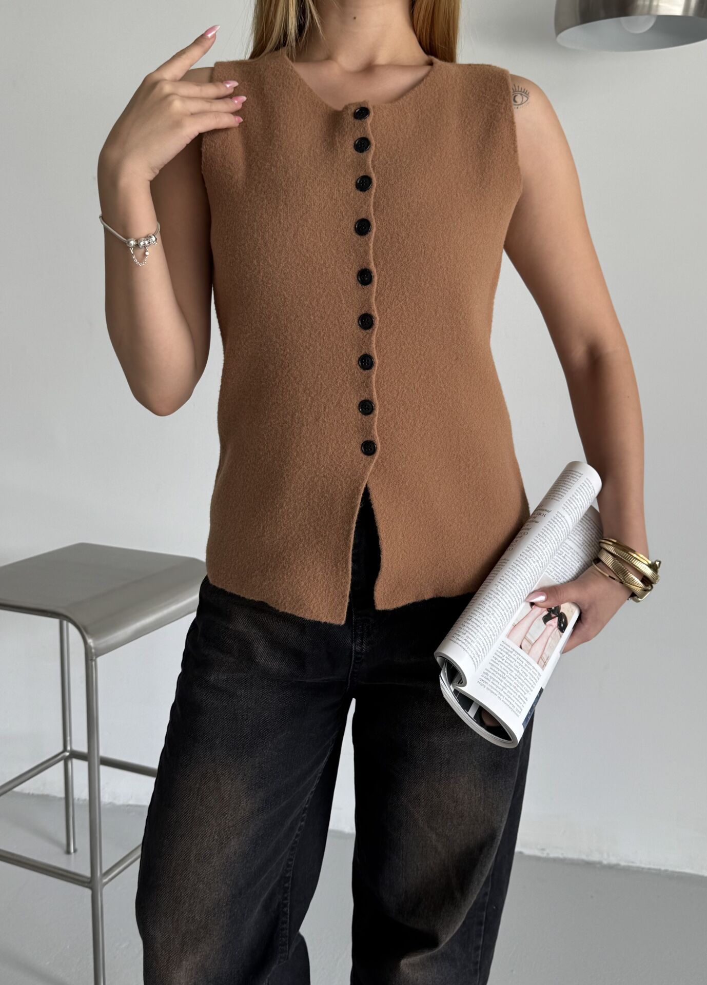 Camel Düğmeli Sıfır Kol Triko Yelek standart cmlylk_7113