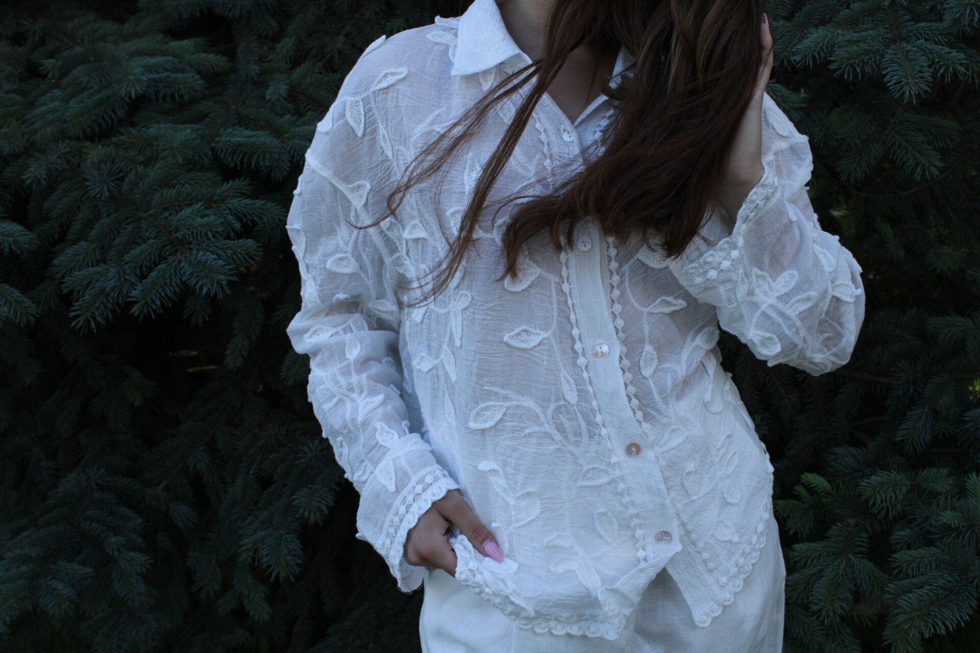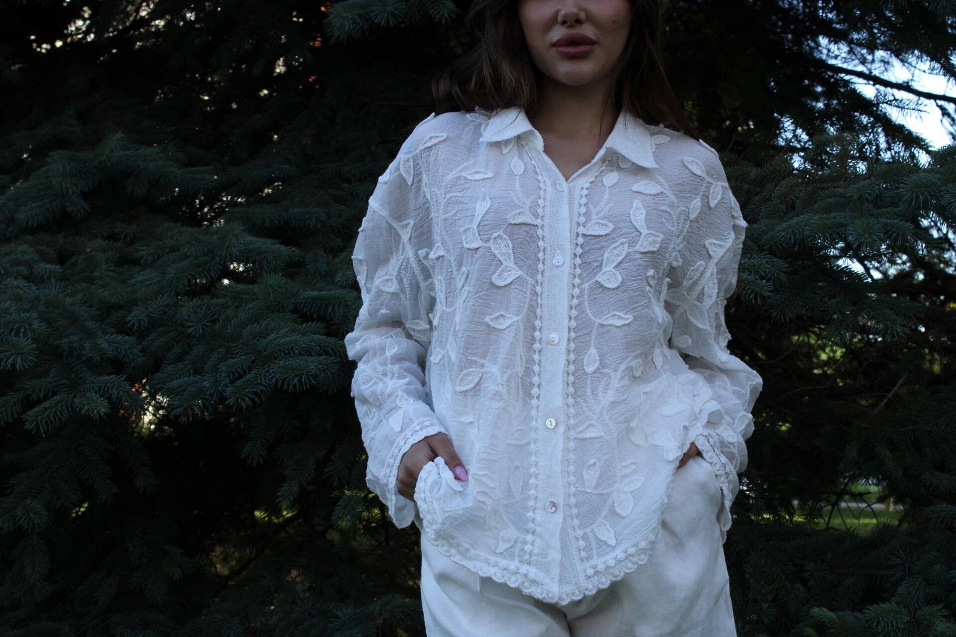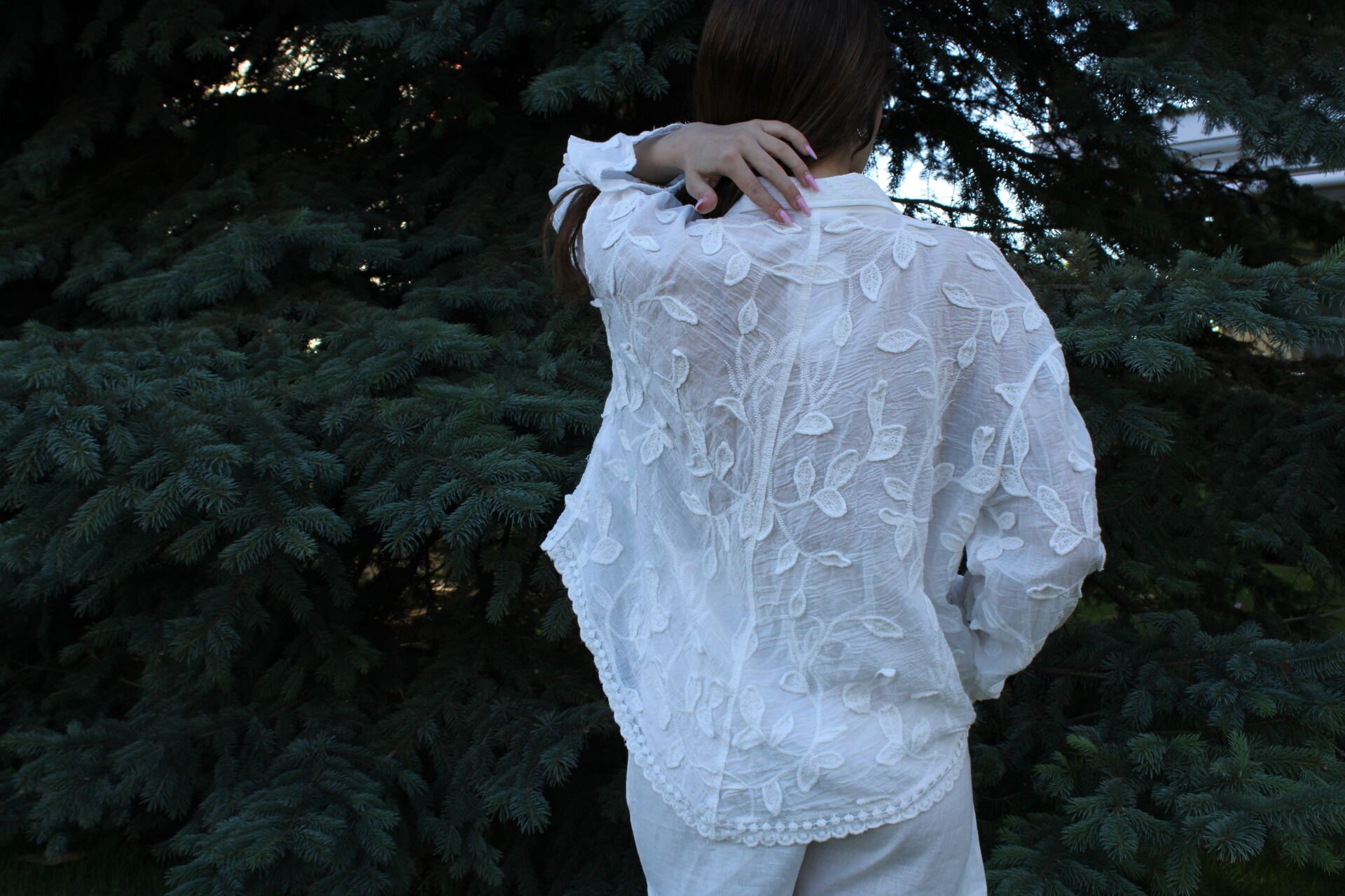 Şıklığı ve zarafeti bir araya getiren bu dantel detaylı gömlek, bahar ve yaz sezonunun favorisi olmaya aday! İnce işçiliğe sahip yaprak desenli işlemeleri, romantik havası ve hafif dokusuyla hem gündüz hem gece kombinlerine kolayca uyum sağlar.