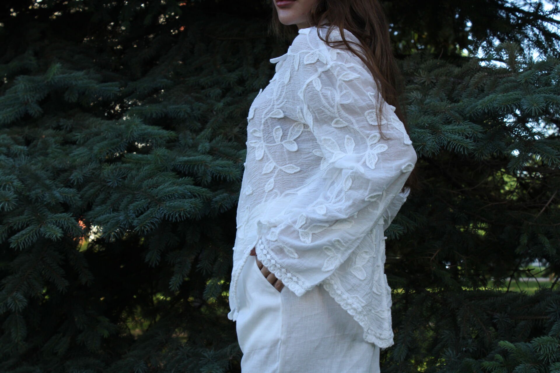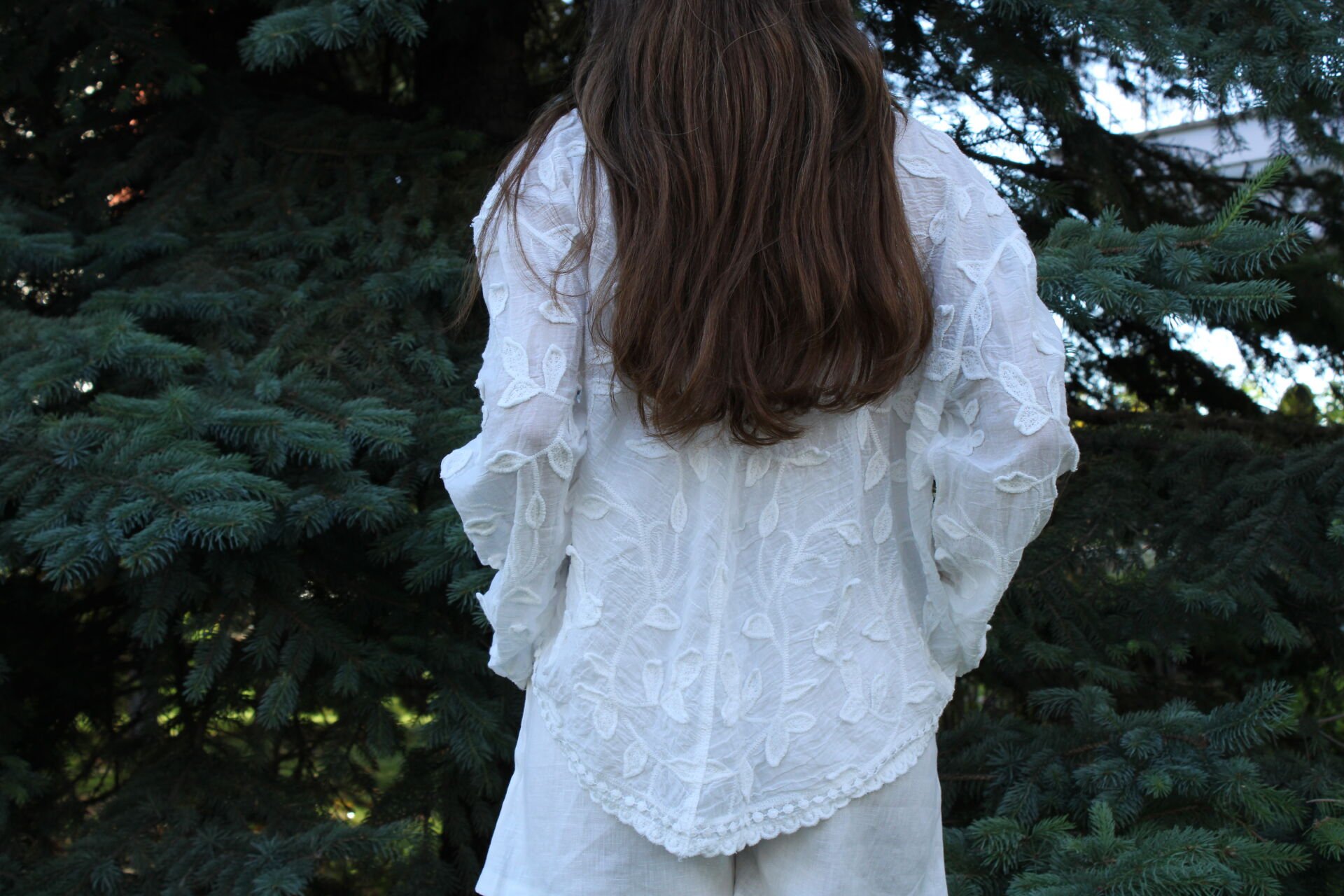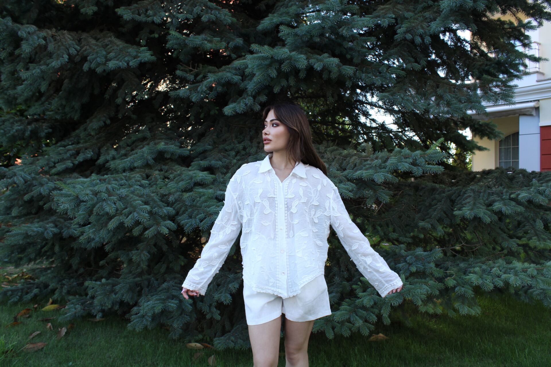 Şıklığı ve zarafeti bir araya getiren bu dantel detaylı gömlek, bahar ve yaz sezonunun favorisi olmaya aday! İnce işçiliğe sahip yaprak desenli işlemeleri, romantik havası ve hafif dokusuyla hem gündüz hem gece kombinlerine kolayca uyum sağlar.