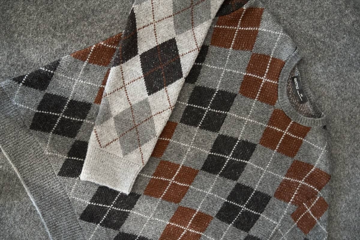 Gri Siyah Baklava Desen Bisiklet Yaka Oversize Triko Kazak