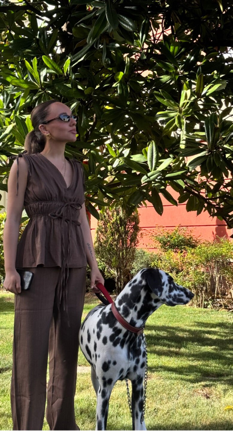 Kahverengi pamuk takım, doğal tonları seven stil sahibi kadınlar için çok yönlü bir kullanıma sahiptir. Beyaz crop bluz veya ince askılı atletle sadeleştirilebilir; hasır çanta ve deri sandaletlerle desteklenerek Akdeniz esintisi yaratılabilir. Daha klasik bir görünüm için topuklu terlik ve altın aksesuarlarla tamamlanabilir.