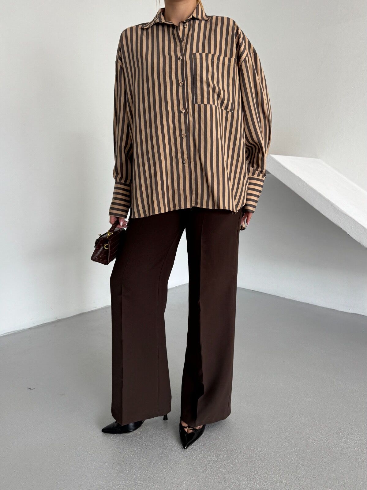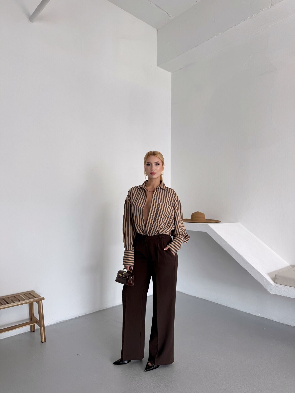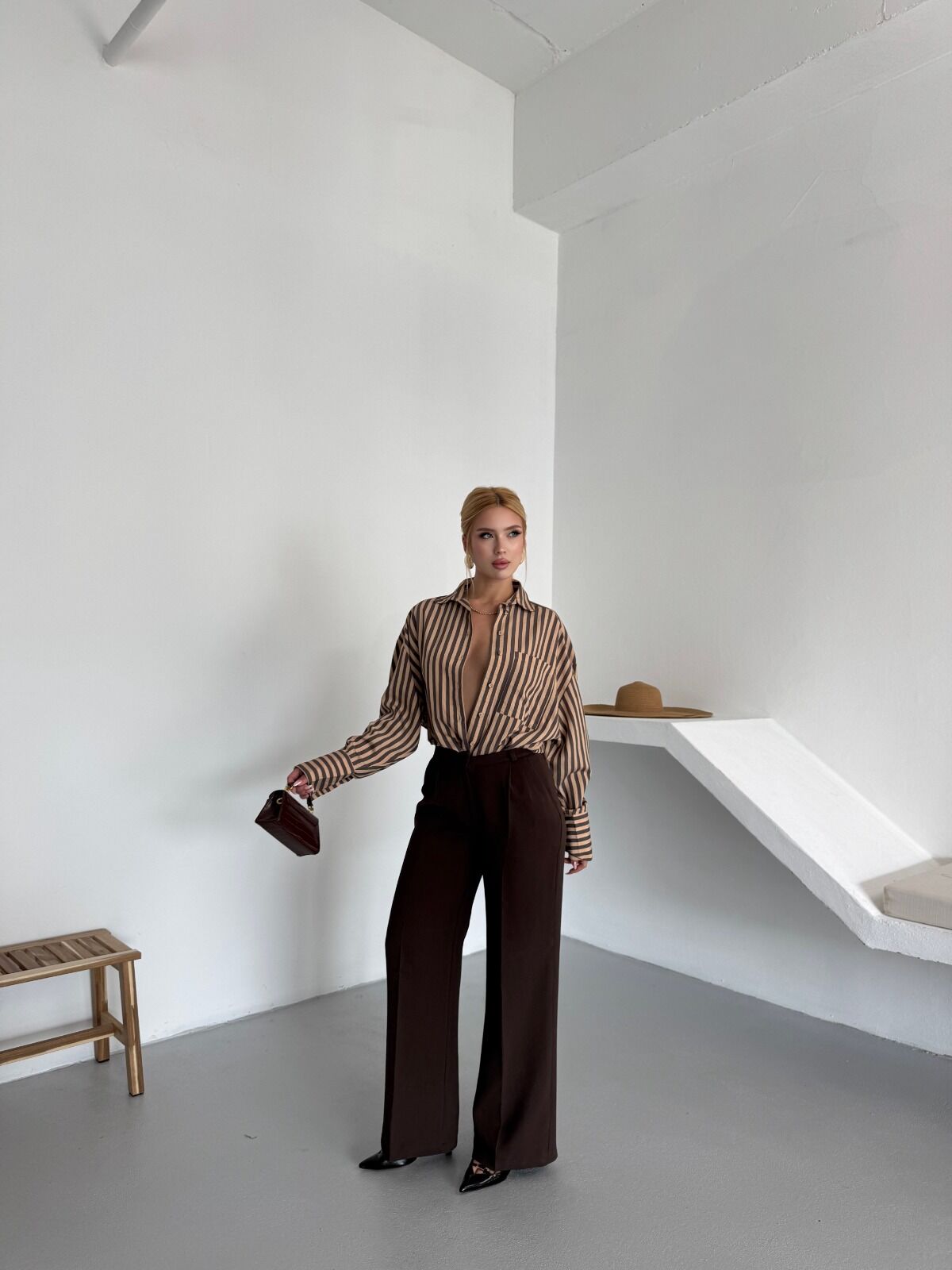Kahverengi palazzo pantolon, şıklığı ve konforu bir arada sunar. Geniş paçası ve hafif kumaşıyla hareket özgürlüğü sağlar. Günlük ve özel davetler için ideal olan bu pantolon, farklı üstlerle kolayca kombinlenebilir. Modern ve zarif duruşuyla gardırobunuzun vazgeçilmezi olacak.