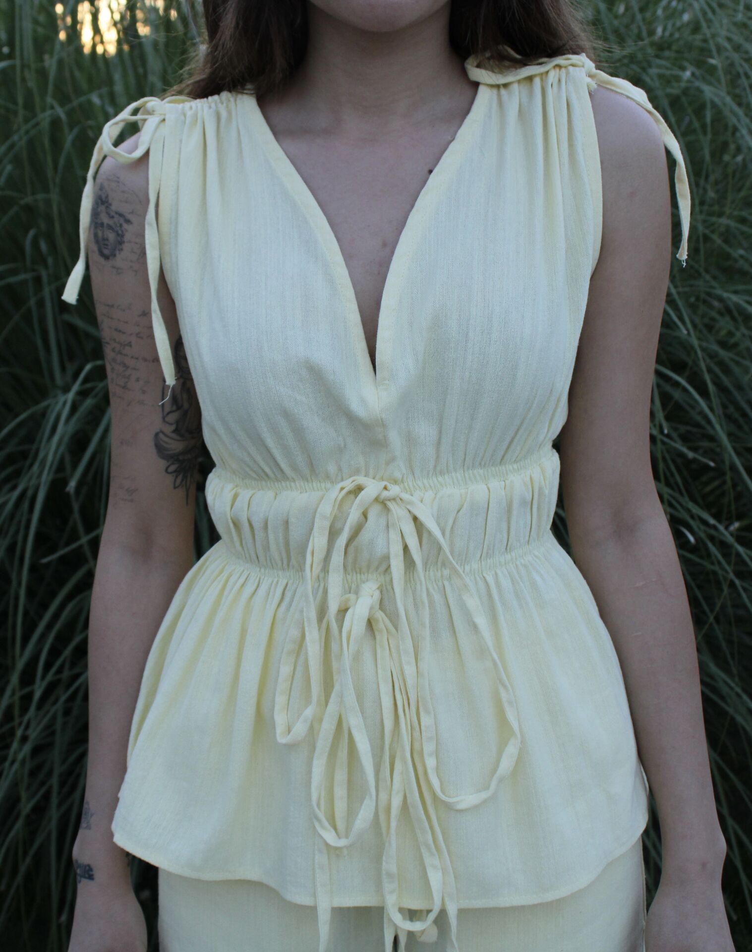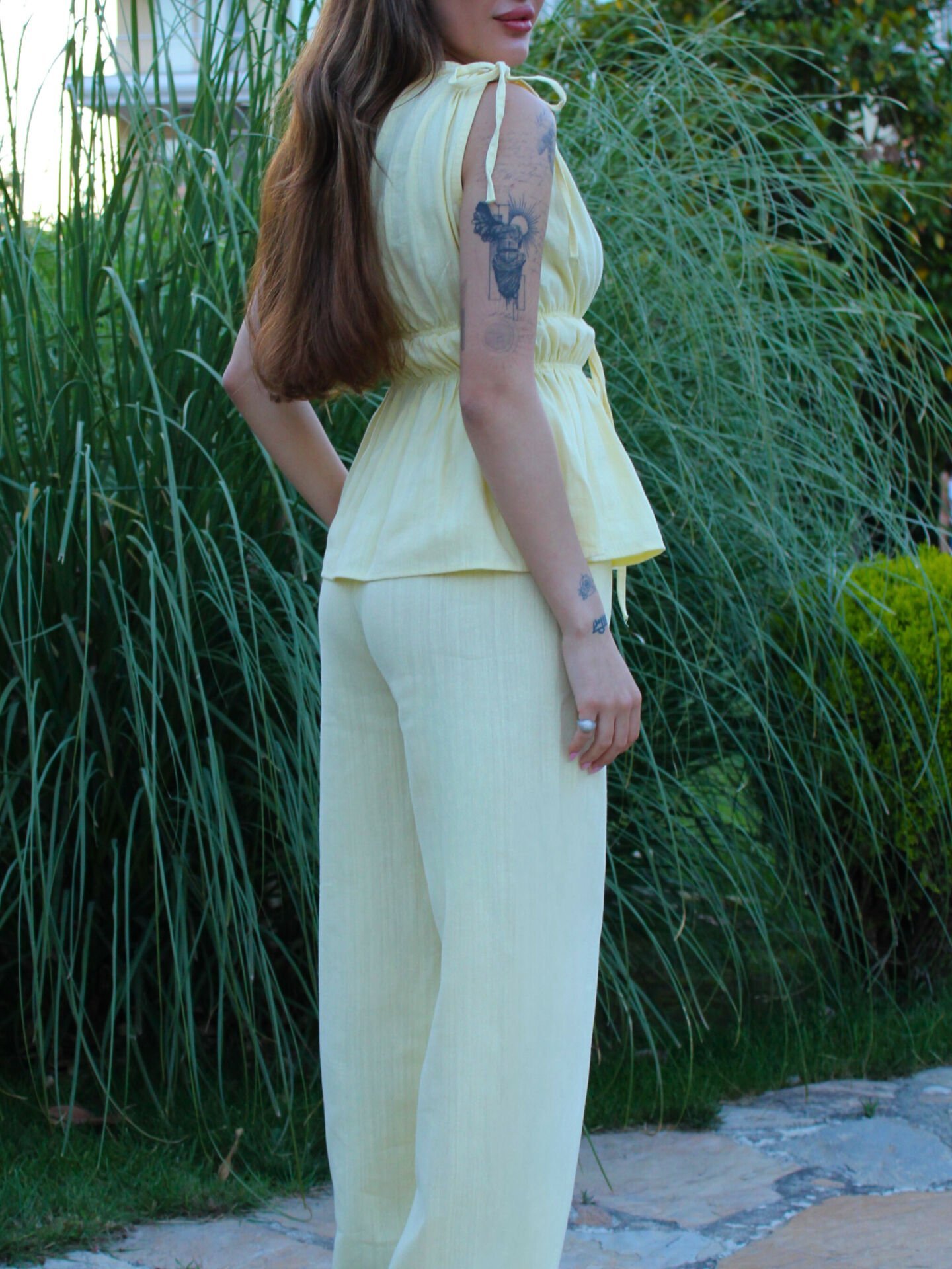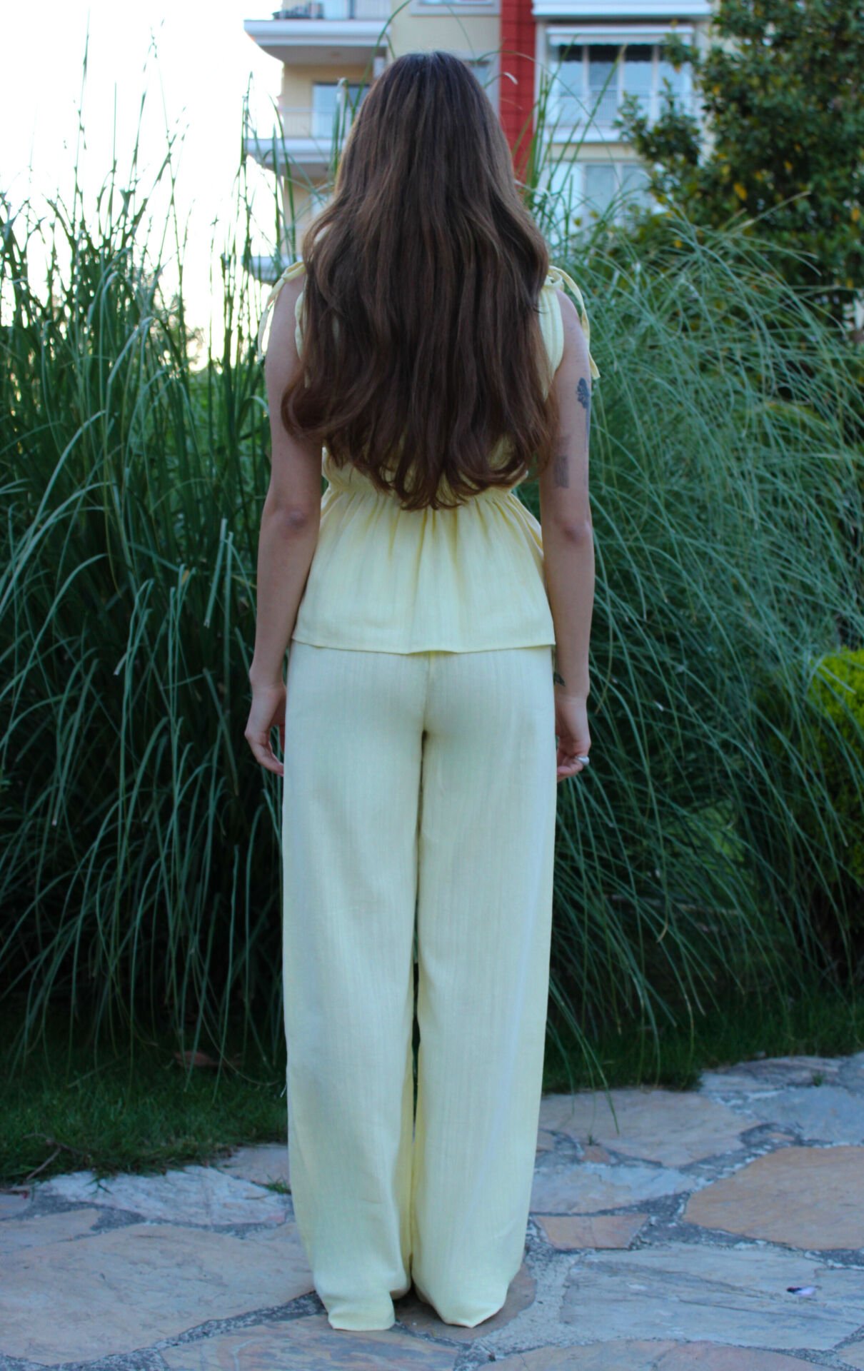 Lastik Detaylı Sarı Pantolon Bluz Takım