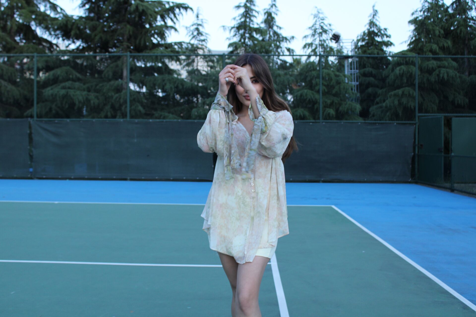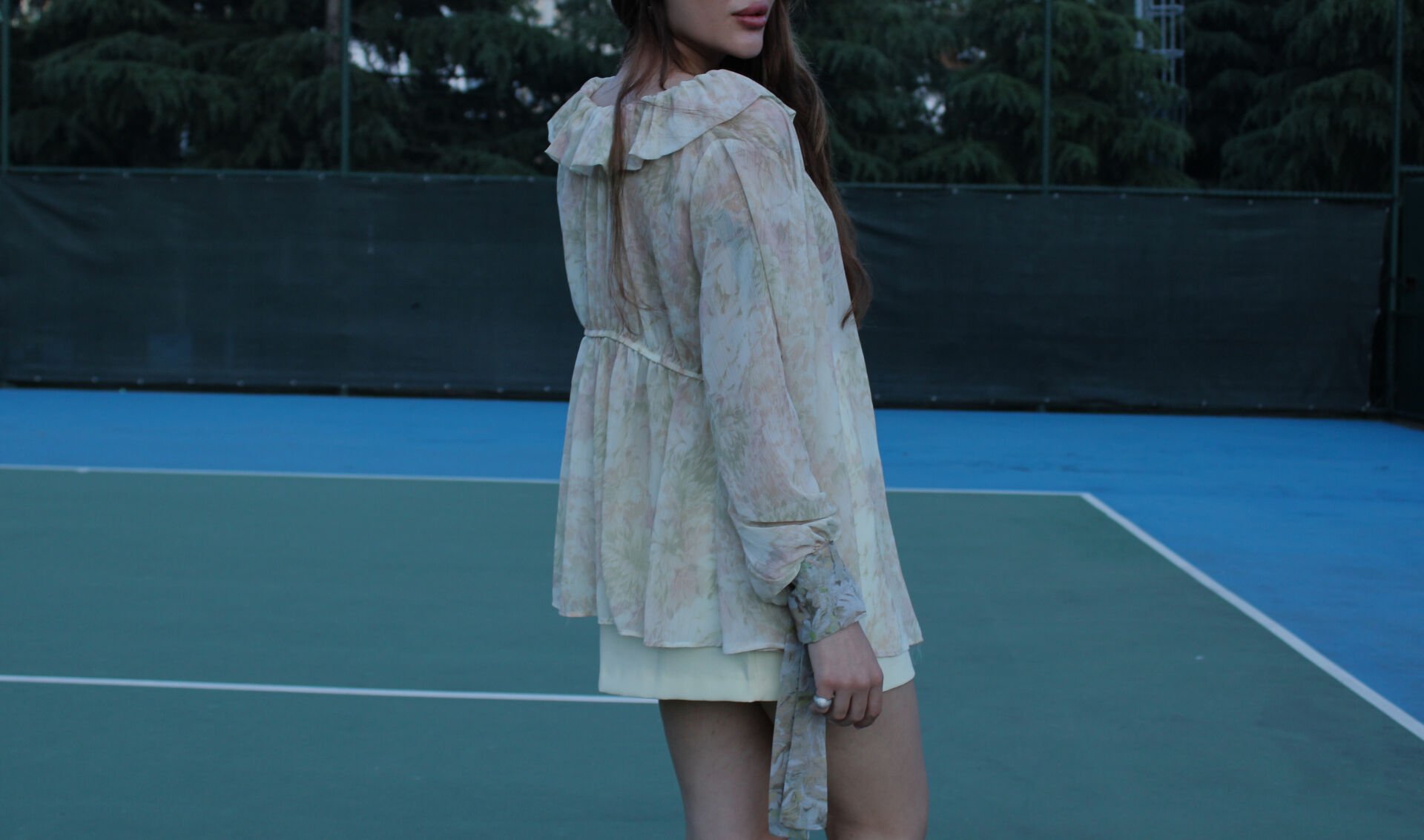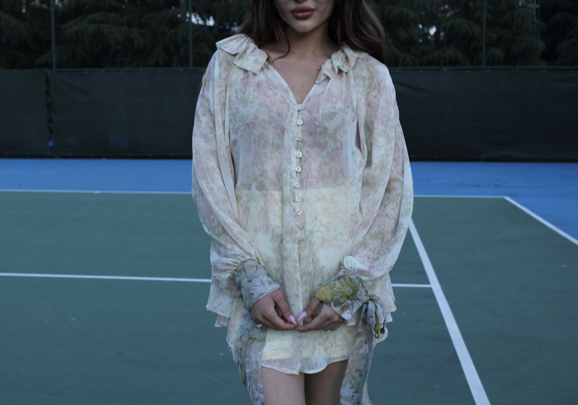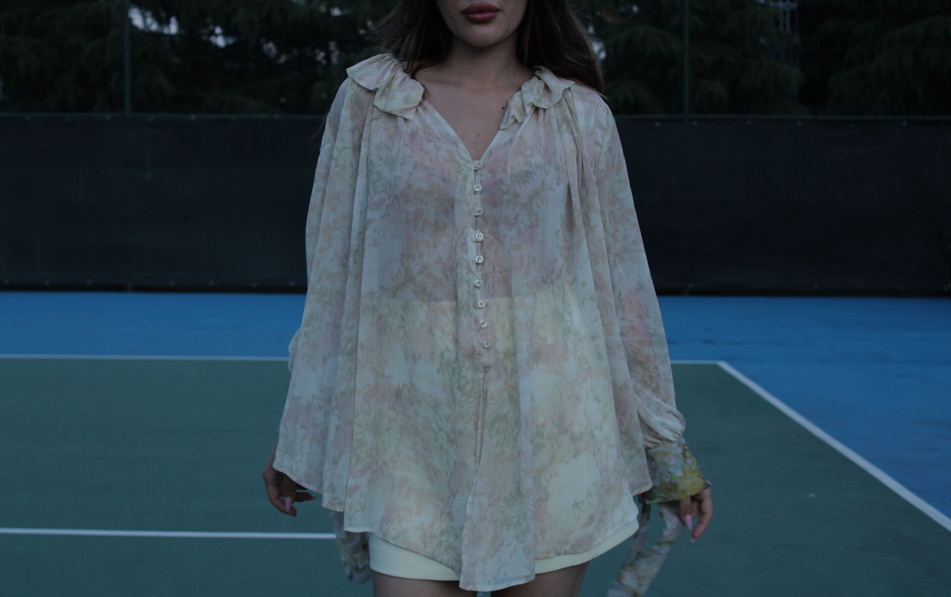 UZUN KOLLU, V KESİM, ÖNÜ VE KOL MANŞETLERİ DÜĞMELİ, YAKASI VE KOLLARI FIRFIR DETAYLI, TRANSPARAN, ŞİFON GÖMLEK